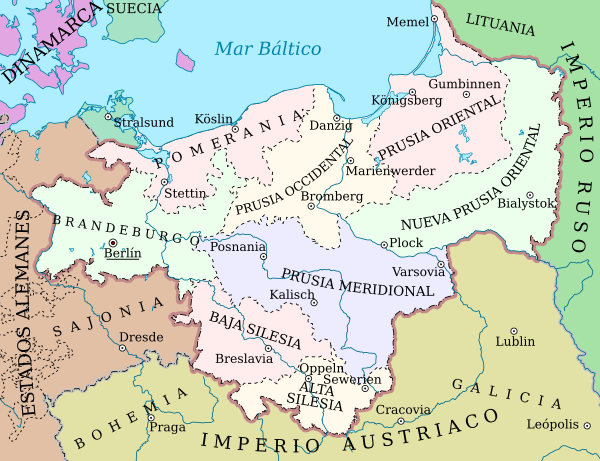 В начале XX века королевство Пруссия включало в себя «собственно Пруссию» (Восточную и Западную Пруссию), Бранденбург, провинцию Саксония (территория нынешней земли Саксония-Анхальт и часть земли Тюрингия), Померанию, Рейнскую провинцию, Вестфалию, Силезию, Лужицу, Шлезвиг-Гольштейн, Ганновер, Гессен-Нассау и провинцию Гогенцоллерн.
