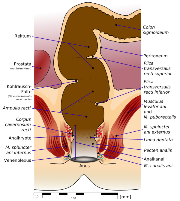 - промежностный отдел находится под диафрагмой таза и представляет собой заднепроходной канал. Длина промежностного отдела составляет примерно 4 см. Промежностный отдел заканчивается анусом.