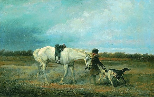 На картине представлен осенний пейзаж с облачным небом и пожелтевшей травой. В центре изображён мальчик в коричневом полушубке и высокой шапке, который правой рукой, прикрывая лицо от ветра, ведёт за уздечку белую оседланную лошадь. Левой рукой он сдерживает двух охотничьих собак, привязанных к его поясу: одна из них коричневая с белой грудью, другая — белая с тёмными пятнами. На заднем плане виднеется небольшой лесок. Сцена передаёт повседневный момент из сельской жизни, характерный для бытового жанра.