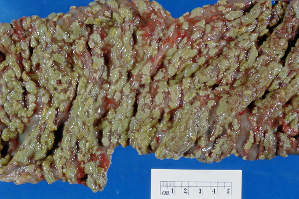 Гистологическое исследование подтверждает наличие некроза эпителия с фибриновым налётом, нейтрофильным инфильтратом и глубокими язвами слизистой оболочки с формированием псевдомембран[11].
