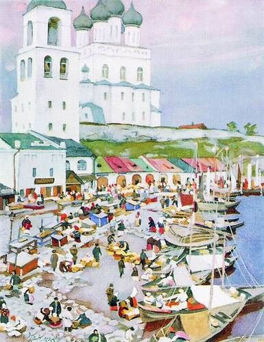 К концу XV века население Пскова составляло более 30 тысяч человек. Большую часть городского населения составляли ремесленники и торговцы. Ремесло в Пскове было менее развито, чем в Новгороде, но и здесь было много искусных мастеров: кузнецов, каменщиков, кожевников, гончаров, ювелиров. Главными хозяевами псковской торговли были купцы. Псковское купечество вело торговлю с городами Прибалтики и Литвы, а также с русскими городами. В XV веке укрепились торговые связи Пскова с Москвой. Псковичи продавали лён, кожи, рыбу, мёд, воск, меха, а покупали соль, сукно, железо, изделия из металла и другие товары[27]. Развитие торговли в Псковской земле привело к созданию собственной монетной системы. С 1425 года псковичи стали чеканить свою монету из высокопробного серебра и чеканили её до 1510 года.