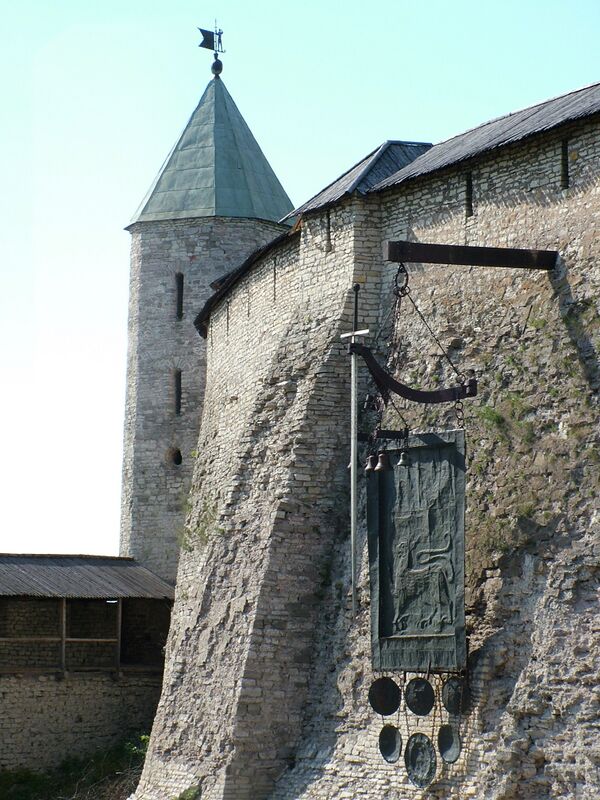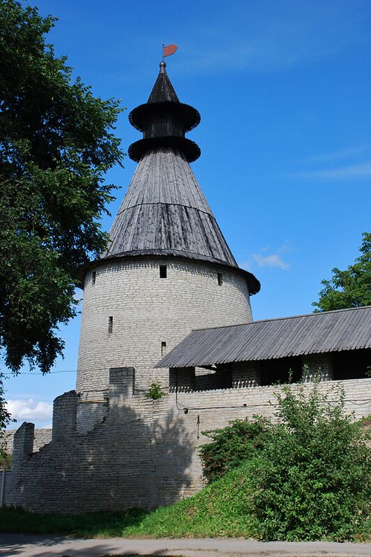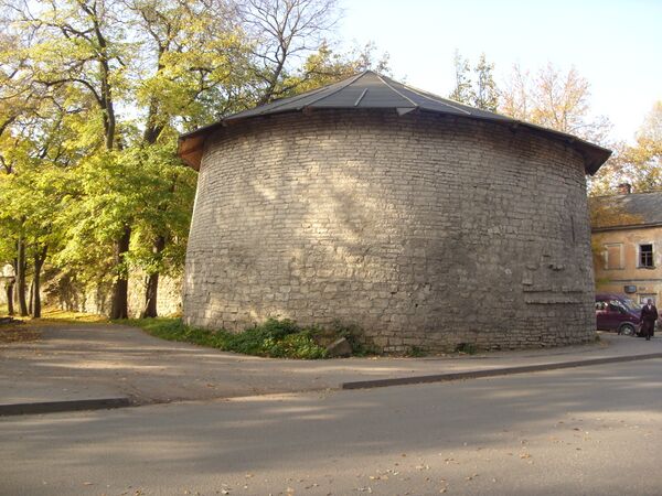 - Довмонтова башня (первоначально Смердья башня с воротами (захабом), в XIX веке разрушена и перестроена в многогранную Довмонтову без ворот)