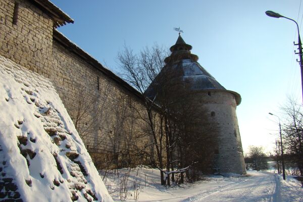 Первые каменные укрепления были возведены в середине XIII века. В начале XV века в связи с развитием артиллерии Псковскую крепость стали усиливать башнями. Псковская крепость являлась одной из лучших русских крепостей в XVI веке. Территорию площадью 2,15 км2 (215 га) ограждали 5 поясов каменных укреплений протяженностью 9 км, усиленные 40 башнями, 14 воротами, настенными, башенными и подземными переходами[3].