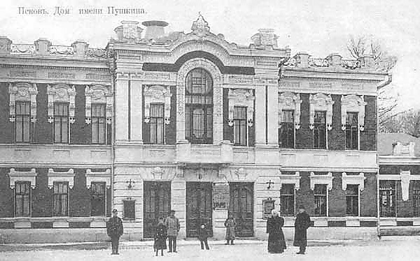 В 1899 году в год столетия со дня рождения А. С. Пушкина на народные средства началось строительство здания Народного дома по проекту псковского архитектора Э. А. Гермейера, завершено в 1906 году. На сцене Народного дома начала XX века — спектакли, выступление эстрадных певцов и артистов балета (Ольга Иосифовна Преображенская, Матильда Феликсовна Кшесинская, Тамара Платоновна Карсавина). В 1918 году помещения Народного дома переданы Коммунальному театру им. А. С. Пушкина.