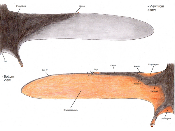Крылья птерозавров были образованы мембраной из кожи и других тканей. Основная мембрана крепилась к удлинённому четвёртому пальцу передней конечности и тянулась по бокам тела к лодыжкам[16].