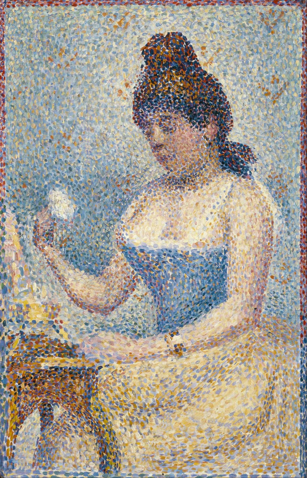 Когда картина была выставлена на всеобщее обозрение, на стене позади молодой женщины появилась бамбуковая рама с изображением вазы с цветами[3]. В 2014 году с помощью инфракрасной спектроскопии изображения было обнаружено, что изначально Сёра изобразил самого себя за мольбертом, так что в настоящее время объект на стене считается зеркалом[6]. Показав картину другу, Сёра по его совету написал поверх собственного портрета стол и цветы[3][5]. По иронии судьбы, этот скрытый портрет остался единственным известным автопортретом Сёра.