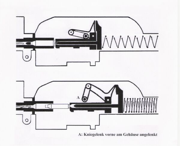 После выстрела затвор под действием отдачи двигался назад с системой рычагов и ударным механизмом. Затвор сжимал винтовую возвратно-боевую пружину, которая располагалась в задней части короба. После достижения крайнего заднего положения затвор, под воздействием распрямляющейся возвратно-боевой пружины, двигался вперёд, подхватывал очередной патрон и досылал его в патронник. Система рычагов складывалась, тормозя затвор и смягчая удар в передней точке. Канал ствола запирался, ударник оставался взведённым.
