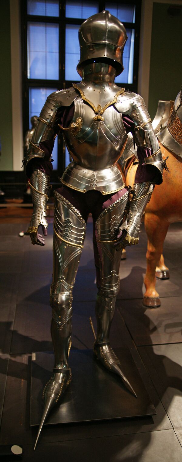 Мода коснулась и военной формы рыцарей: кованные железные ботинки с длинными носками назывались саботины[1].