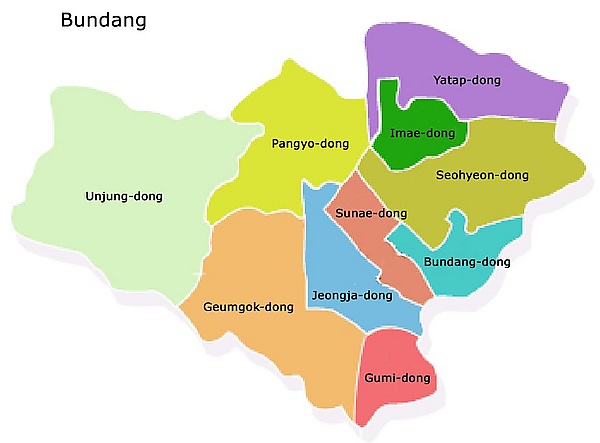 - Унджон-дон (운중동) [подразделяется на Унджон-дон, Хасанун-дон, Согун-дон и Дэджанг-дон (하산운동, 석운동, 대장동)]