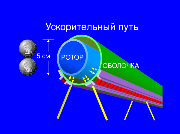 Хотя петля очень длинная, примерно 4000 км, ротор сам по себе довольно тонкий, около 5 см в диаметре, а оболочка не намного большего размера. Ротор выполнен из ферромагнитного железа в виде шнура или трубки, с продольными компенсаторами примерно через каждый метр. Ротор отделяется от оболочки серво-стабилизирующими магнитными подшипниками. Оболочка герметичная, с поддержанием вакуума, чтобы свести к минимуму сопротивление, оказываемое на ротор.
