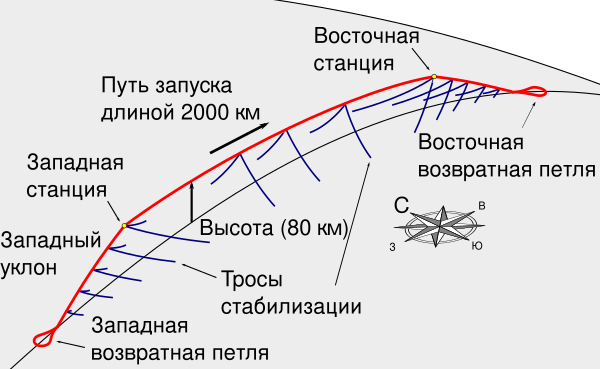 Пусковая петля представляет собой конструкцию размером около 2000 км. Сама петля поднимается от поверхности земли до высоты 80 км, проходит на этой высоте 2000 км, снова опускается к поверхности земли, разворачивается и затем повторяет весь путь назад к исходной точке. Петля имеет форму трубки, полой внутри и называемой оболочкой. Внутри оболочки подвешена другая сплошная трубка, называемая ротором, который представляет собой шнур или цепь. Ротор сделан из железа и имеет диаметр примерно 5 см. Он движется по окружности внутри петли со скоростью 14 км/с.