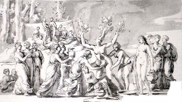 Несмотря на одолевавшие в 1650-е годы Пуссена многочисленные болезни, он неуклонно противостоял слабости плоти и находил возможность развивать собственное творчество. Новые работы свидетельствовали об интенсивных поисках в области раскрытия трагического в живописной сцене. Картина «Рождение Вакха» известна по описанию Беллори, который подчеркнул, что сюжет её двойной — «Рождение Вакха и смерть Нарцисса». В одной композиции были объединены два источника: «Метаморфозы» Овидия и «Картины» Филострата, причём в овидиевой поэме данные мифологические события последовательно следуют один из другим и позволяют художнику построить сюжетный мотив на контрасте[145]. Центральная сцена посвящена Меркурию, который приносит младенца Вакха на воспитание нисейским нимфам. Передавая Вакха нимфе Дирке, он указывает одновременно на Юпитера в небесах, которому Юнона преподносит чашу с амброзией. Пуссен изобразил всех семерых нисейских нимф, поместив их перед пещерой Ахелоя. Она обрамлена виноградом и плющом, которые прикрывали младенца от пламени, в образе которого Юпитер явился Семеле. Из Филострата был заимствован образ Пана, играющего на флейте в роще наверху. В правом нижнем углу картины показаны мёртвый Нарцисс и оплакивающая его Эхо, которая опирается на камень, в который должна обратиться. Этому сложному набору сюжетов критики, в первую очередь, давали аллегорическую интерпретацию, видя во младенце Вакхе мотив возникновения жизни, в Нарциссе — её окончания и возрождения вновь, поскольку из его тела вырастают цветы. По мнению Ю. Золотова, данная композиция развивала один из мотивов «Аркадских пастухов». Объединение в одном сюжете радости бытия, безмятежности и мотива неизбежной смерти полностью отвечало всей образной системе Пуссена. В «Аркадских пастухах» символы смерти волновали героев, в «Рождении Вакха» поющие нимфы не замечают ни гибели Нарцисса, ни трагедии Эхо. Как и обычно, это не мифологическая иллюстрация, а самостоятельная поэтическая структура. В композиции можно найти известные параллели «Царству Флоры», а техническое решение уравновешивание сцен, с расположением их на дополнительных оптических осях, аналогично[146].