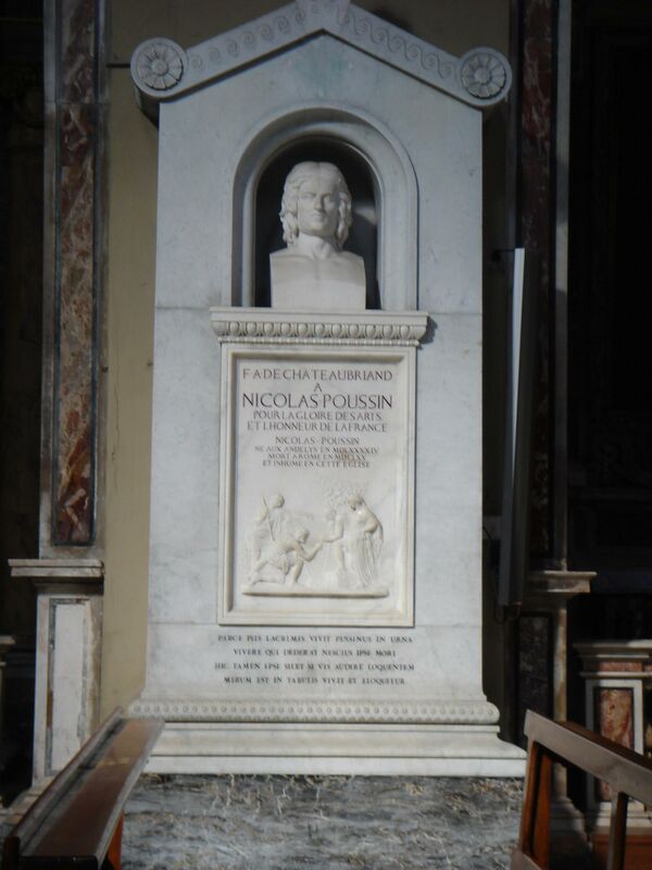 Памятники Пуссену стали устанавливать с первой половины XVIII века — по мере утверждения академизма и просвещенческого культа разума. Кавалер д’Аженкур в 1728 году добился установки бюста Пуссена в Парижском Пантеоне[198]. Когда в 1782 году Пуссену был установлен бюст в Риме, на постаменте была помещена латинская надпись — «художнику-философу»[199]. В революционной Франции в 1796 году была отчеканена медаль с профилем Пуссена для награждения лучших учеников художественных школ[198]. Консерваторы XIX века, начиная от аббата Аркилье и Шатобриана, пытались, напротив, вернуть Пуссену ореол истинно христианского художника. Именно Шатобриан добился установки Пуссену роскошного надгробия в церкви Сан-Лоренцо-ин-Лучина. Виктор Кузен рассматривал Пуссена в одном контексте с Эсташем Лесюэром и привязывал их к идеалу «христианского спиритуализма», ключом к которому являлся цикл «Семь таинств». В 1851 году по его инициативе был поставлен памятник в Париже, причём на открытии епископ Эвре отслужил мессу[200]. На малой родине художника — в Вийере — на месте предполагаемого дома его отца, был установлен памятник Пуссену с подписью Et in Arcadia ego[11]. Ещё ранее, в 1836 году, статую Пуссена установили во Французской академии наук[201].