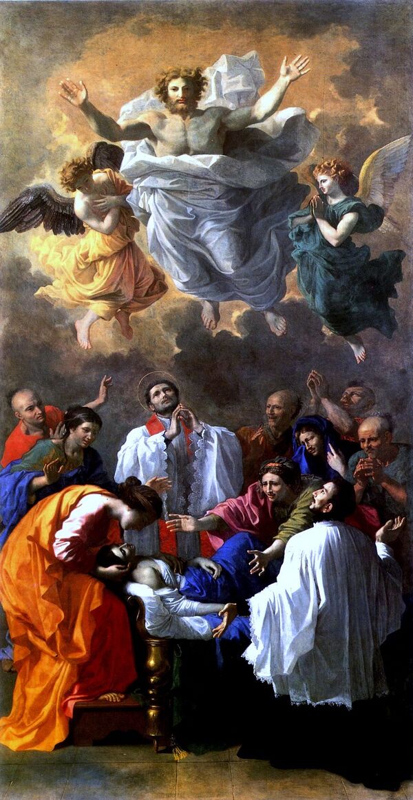 По заказам Шантелу после 1643 года Пуссен создал несколько картин, изображающих экстазы святых и вознесение апостолов и Богородицы. Первым было написано «Вознесение святого апостола Павла», второй вариант того же сюжета на увеличенном холсте был написан в 1649—1650 годах для Лувра. Основой послужило Второе послание к коринфянам (2Кор. 12:2), но при этом решение сюжета было нехарактерным для Пуссена, зато имело множество параллелей в искусстве барокко, для храмовой архитектуры которого мотив прорыва в иную — высшую реальность — позволял достигать множества эффектов. Похожим образом было исполнено и «Вознесение Богородицы» 1650 года. Эти сюжеты были весьма популярны в католической историографии времён Контрреформации, однако Пуссен обращался к ним чрезвычайно редко. Ещё во время конфликтов вокруг Большой галереи Лувра Пуссен категорически заявлял, что ему непривычно видеть человеческие фигуры в воздухе. Если сравнивать вознесения Пуссена с аналогичными сюжетами у Бернини, у французского художника нет явной иррациональности, потусторонности импульса, устремляющего святого в горний мир. Сила подъёма и земного тяготения уравновешены, группа, парящая в воздухе, геометрически кажется совершенно устойчивой. На луврском варианте вознесения апостола Павла мотив устойчивости подчёркивается мощностью каменной кладки и вырастающими из неё объёмами, скрытыми облаками, ангелы при этом сложены весьма атлетически. Лаконизмом и ясностью отмечен выразительный натюрморт из книги и шпаги, очертания которых строго параллельны плоскости холста и граням каменных устоев[128]. Эти решения, описанные в письме 1642 года Сюбле де Нойе, Ю. Золотов предлагал называть пуссеновским «конструктивизмом». Живописные произведения Пуссена, несомненно, строились по законам тектоники и в какой-то степени подчинялись законам зодчества. Конструктивизм позволял придавать живописность любой конструкции, неважно, были для неё иконографические предпосылки или нет[129].