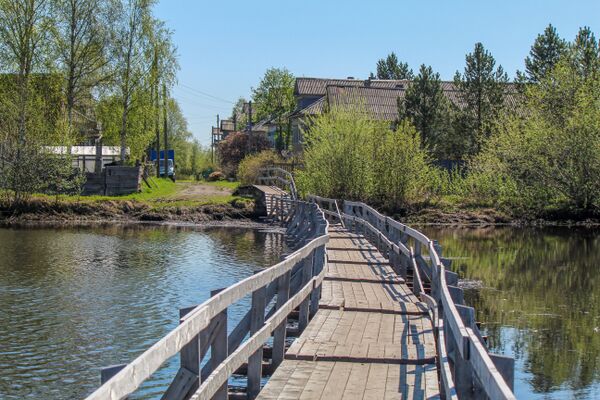 Что бы добраться до деревни от пристани «Выселки», на которую приходит теплоход требуется пройти по деревянному мосту, лежащему на воде.