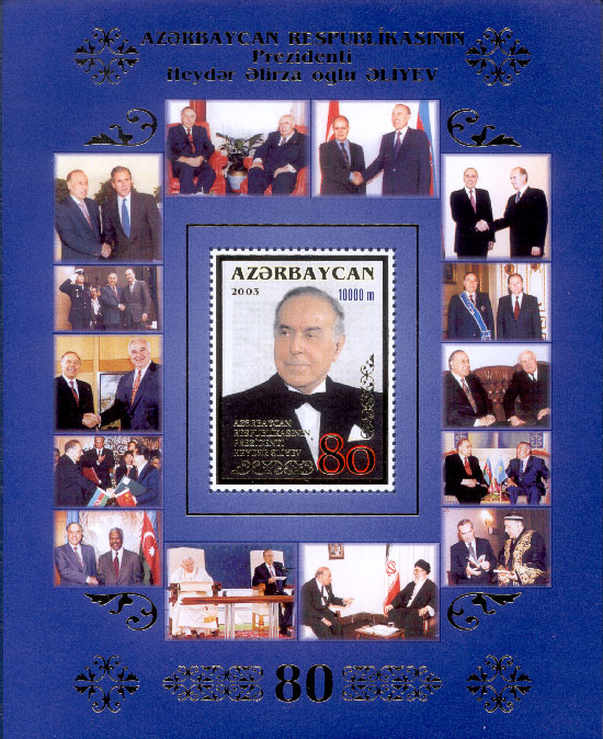Почтовый блок Азербайджана в честь 80-летия Г. Алиева (2003, 10 000 манат). Справа на верхней фотографии на поле блока — Владимир Путин