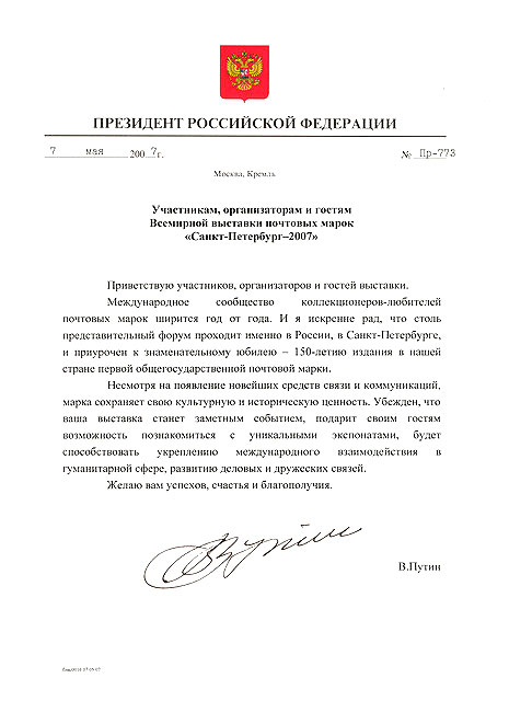 Официальное приветствие, которое Президент Российской Федерации В. Путин направил в адрес участников, организаторов и гостей Всемирной выставки почтовых марок «Санкт-Петербург—2007»