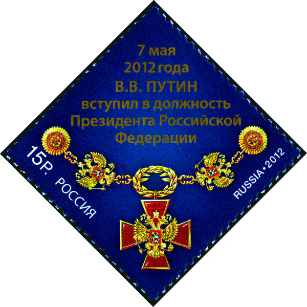 После победы Владимира Путина на президентских выборах 2012 года была выпущена почтовая марка, приуроченная к его вступлению в должность президента Российской Федерации. На марке номиналом 15 рублей размещён памятный текст и изображён Знак Президента Российской Федерации. Марка была выпущена тиражом в 630 000 экземпляров. Художник марки — А. Московец. Марочные листы включали 9 (3 × 3) марок[2].