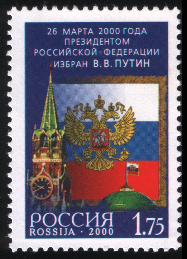 Первая почтовая марка «путинской» тематики появилась в обращении 7 мая 2000 года по случаю инаугурации В. В. Путина тиражом 350 тыс. экземпляров (ЦФА [АО «Марка»] № 584). Её автор — художник И. Комаров. На марке номиналом в 1 рубль 75 копеек размещён текст об избрании Владимира Путина президентом России 26 марта того же года. Марочные листы включали 36 (6 × 6) марок[1].