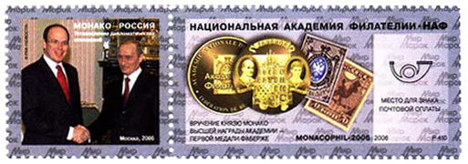 В 2006 году выходила российская рекламная марка в связи с вручением князю Монако Альберу II награды Национальной академии филателии (НАФ) — медали Фаберже. Марка была подготовлена художником Юрием Клименко. На купоне марки изображён Альбер II во время встречи в Москве с Владимиром Путиным[15][16].