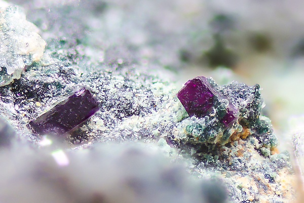 Кристаллы полупрозрачные фиолетовые, но имеют выразительный плеохроизм (от бледно-фиолетового до бледно-голубовато-серого в зависимости от угла наблюдения) и оставляют розовые полосы при натирании по ровной поверхности.