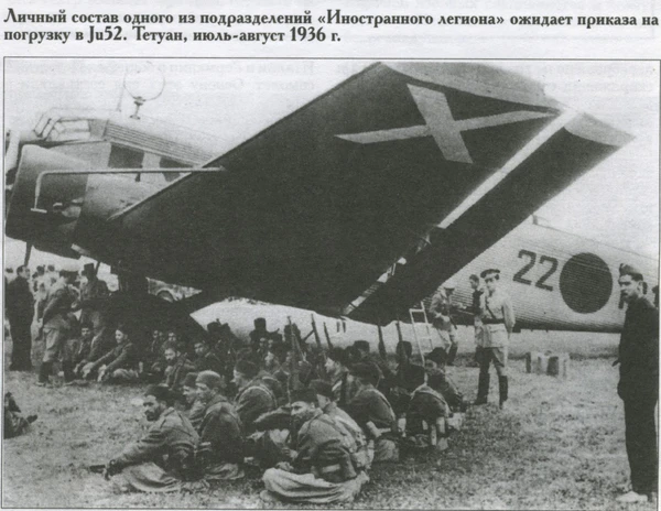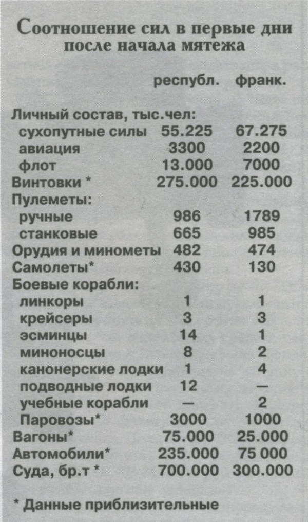 Другой ударной силой мятежа стал 11-тысячный испанский Иностранный легион, набранный из иностранных искателей приключений и преступников. Против республики выступили и собственно испанские части Африканской армии (20 тысяч человек). Африканская армия имела боевой опыт в Рифской войне и считалась элитной в испанских вооружённых силах. Она была несравненно сильнее континентальных войск, и, то, что Африканская армия почти в полном составе примкнула к мятежу, стало существенным успехом руководителей путча.