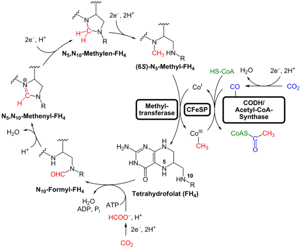 Две молекулы СО2 восстанавливаются независимо, в разных (карбонильной и метильной) ветках пути Вуда-Льюнгдаля. Метильная ветвь включает последовательность реакций, которая приводит к восстановлению СО2 до метильной группы -СН3. Метильная группа при этом связана тетрагидрофолатом (FH4) в бактериях и метанофураном (MFR) и тетрагидрометаноптерином (H4MPT) в археях, в качестве коферментов-переносчиков. Карбонильная часть пути включает восстановление второй молекулы CO2 до карбонильной группы (-СО), связанной с ферментом CO-дегидрогеназой, катализирующим эту реакцию. Затем метильная группа комбинируется с карбонильной группой и коферментом А, образуя молекулу ацетил-КоА. В этом участвуют особый фермент: ацетил-КоА-синтетаза[1][8]. В микроорганизмах они могут быть представлены как два отдельных фермента, так и как бифункциональный ферментный комплекс, объединяющий обе эти активности. Ключевой фермент пути (СО-дегидрогеназа/ацетил-КоА синтаза) может составлять существенную часть от всего растворимого клеточного белка (например, от 6 до 9% у Moorella thermoacetica)[9]. СО-дегидрогеназа/ацетил-КоА синтаза имеет общее происхождение у всех прокариот, использующих этот путь[10].