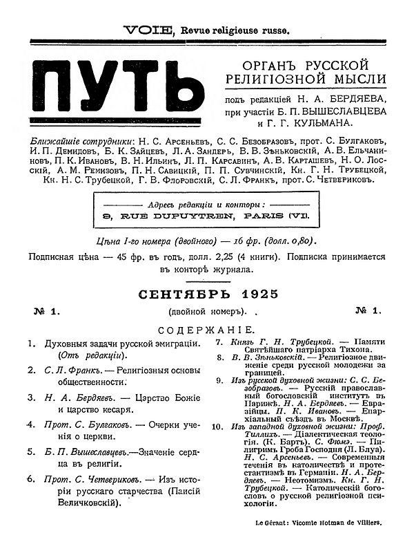 К сентябрю 1925 года был подготовлен первый номер академического журнала. Он открывался редакционной статьёй «Духовные задачи русской эмиграции», в частности провозглашавшей: