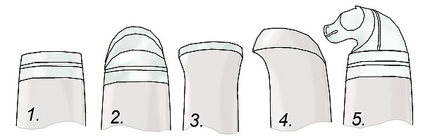 На рукояти обычно отсутствуют выраженные подпальцевые упоры и гарда. Голова рукояти традиционно имеет изгиб либо «грибок» для удобства вынимания ножа из ножен; иногда на голове размещают своеобразный гребень для определения пространственной ориентации клинка на ощупь; в некоторых разновидностях голова украшена объёмным изображением животного из медного сплава, чаще всего головой лошади.