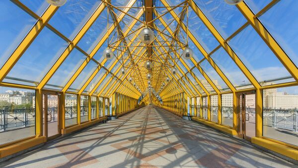 Главная арка пешеходного моста, массой около 1500 тонн, была перемещена на нынешнее место тремя баржами в 1999 году. Весь комплекс работ занял 11 месяцев, судоходство по реке было перекрыто на восемь с половиной суток, а собственно буксировка проводилась 22 мая 1999 года и заняла полтора часа. Так как русло реки на новом месте шире, чем в Лужниках, то со стороны Фрунзенской набережной арка опирается не на шарнир береговой опоры, а на выносную русловую опору; между шарниром арки и берегом — два железобетонных балочных пролёта по 25 м, декорированные фальшсводами. Опоры стоят на ростверках, под ними — буронабивные столбы и сваи глубиной до 17 м.