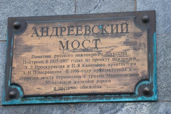 Построен в 2000 году с использованием конструкций старого Андреевского моста, построенного в 1905—1907 годах по проекту инженеров Л. Д. Проскурякова, П. Я. Каменцева и архитектора А. Н. Померанцева и являющегося памятником архитектуры и инженерного искусства. Авторами Андреевского комплекса, состоящего из пешеходного моста, эспланады и нижней набережной Нескучного сада, стали Ю. Платонов и А. Кузьмин[1].