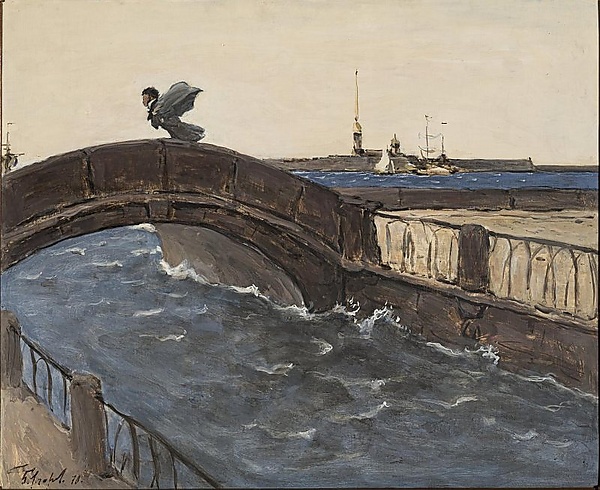 В центре композиции изображён горбатый мостик, по которому идёт Пушкин. На дальнем плане открывается вид на Неву и силуэт Петропавловской крепости. Работа выполнена в жанре ведуты, что подчёркивает значимость архитектурных и ландшафтных элементов городского пространства.