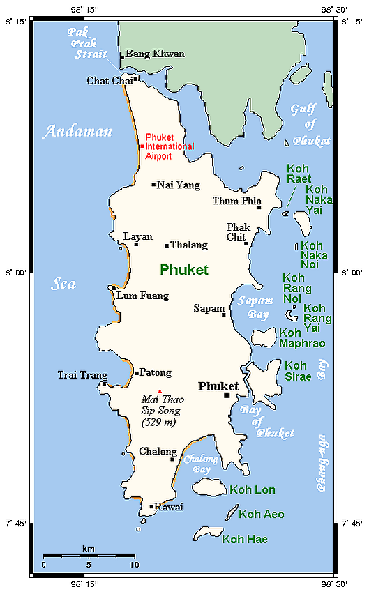 Провинция Пхукет, отстоящая на 863 километра к югу от Бангкока, занимает территорию площадью примерно 576 км², при этом площадь острова Пхукет составляет около 543 км². В числе других, наиболее крупных, можно назвать остров Сире́ (тайск. เกาะสิเหร่), площадью 8,8 км², остров Лон (тайск. เกาะโหลน), площадью 4,77 км², острова Рача-Ной (тайск. เกาะราชาน้อย) и Рача-Яй (тайск. เกาะราชาใหญ่), площадью, соответственно, 3,06 км² и 4,5 км², Мапхра́у (тайск. เกาะมะพร้าว), площадью 3,7 км², и Накха́-Яй (тайск. เกาะนาคาใหญ่), площадью 2,08 км²[31].