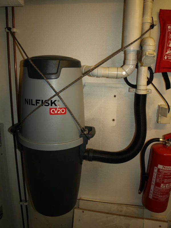Встраиваемый пылесос устанавливается в подсобном помещении, и от него по зданию разводятся воздуховоды с пневморозетками, к которым подсоединяется шланг пылесоса. Загрязнённый воздух выводится на улицу, вентиляцию или канализацию.