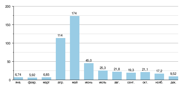Половодье длится с апреля по май. Замерзает в ноябре, вскрывается в апреле.