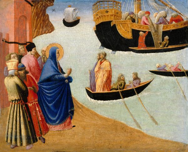 Интерес представляет небольшая деревянная панель с изображением «Въезда Христа в Иерусалим» (26х54 см, 1435—1440 гг., Парма, Галерея Джузеппе Стуарда). Предполагают, что ранее вместе с «Св. Моника провожает св. Августина в Рим» (26х32 см; Художественная галерея, Берлин) и «Рождеством св. Николая» (Базель, Кунстмузеум) она составляла пределлу алтаря, посвящённого этим святым. На фоне деревьев и простирающегося пейзажа художник изобразил группу апостолов с неожиданными, подчас довольно эксцентричными лицами. Художественные эксперты видят в этом произведении свидетельство того, что Пьетро изучал работы Мазаччо. Существует несколько вариантов реконструкции алтаря, которому принадлежала эта пределла. По одной версии это был триптих (Поуп-Хенесси, 1939), по другой версии пентаптих, то есть, полиптих из пяти частей (Кит Кристиансен, 1990; Ада Лабриола, 2008). Центральной панелью полиптиха служила «Мадонна с младенцем» из Бруклинского музея, слева от неё располагался св. Августин из музея Линденау, Альтенбург, а справа, вероятно, утраченная св. Моника. Предполагают, что полиптих был создан для алтаря в капелле св. Николая сиенской церкви Сан Агостино (то есть, Святого Августина).