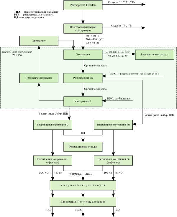 После растворения ТВЭЛов в азотной кислоте исходный раствор, в зависимости от глубины выгорания топлива, содержит 250—300 г/л U, до 3 г/л Pu и до 100 мг/л Np. Исходный раствор фильтруют и направляют на стадию подготовки к экстракции.