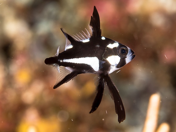 Окраска взрослых особей преимущественно тёмно-коричневая или чёрная. Радужная оболочка глаза жёлтая. Молодь длиной до 20 см окрашена очень контрастно. Верхняя часть тела чёрного цвета с 6—10 белыми пятнами. Нижняя часть тела белая. Через глаз проходит чёрная вертикальная полоса. Широкая чёрная горизонтальная полоса идёт от глаза до заднего края жаберной крышки. От области грудных плавников до заднего края нижней лопасти хвостового плавника проходит чёрная полоса[2][3].