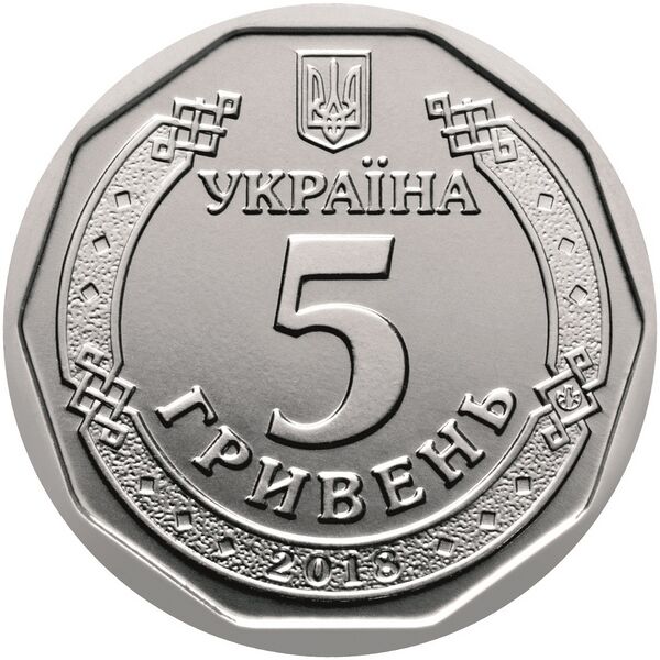 На аверсе пятигривневой монеты, в середине правильного десятиугольника, изображён малый государственный герб Украины, внизу — год выпуска серии (2018) в обрамлении древнерусского орнамента, по центру — надписи в три ряда: «УКРАЇНА / 5 / ГРИВЕНЬ» и логотип Банкнотно-монетного двора Национального банка Украины.[3]