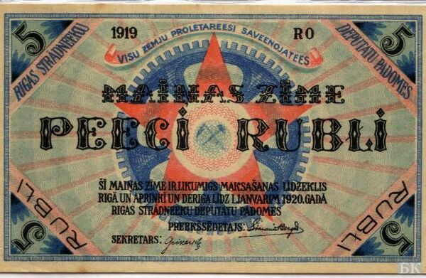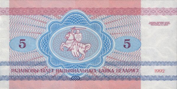 | 181×86 | Розовый | Номинал, герб СССР | Номинал цифрами и прописью на языках республик СССР | «5 рублей» | 1924 | ||