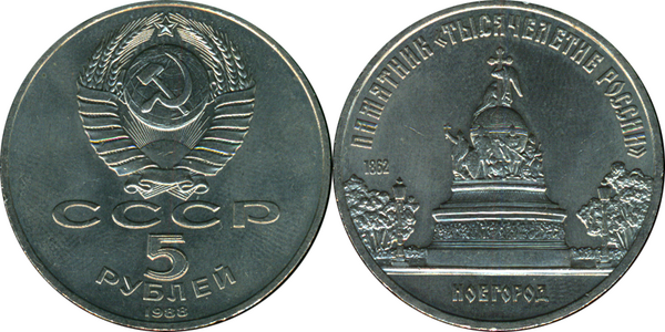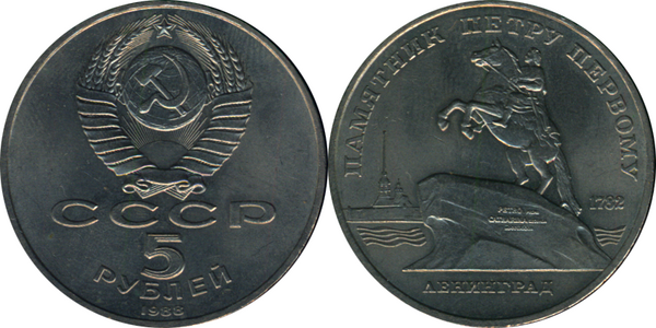 В Советском Союзе в серийное обращение монета номиналом в пять рублей вошла только в 1991 году, во время денежной реформы в СССР.