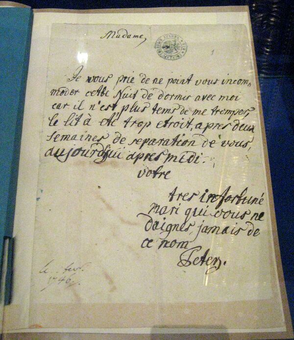 Прошу вас этой ночью отнюдь не утруждать себя, чтобы спать со мною, поелику поздно уже обманывать меня, постель стала слишком узка, после двухнедельной разлуки с вами, сего дня по полудни