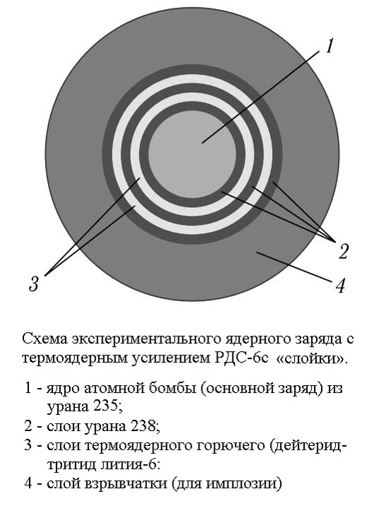 Вариант конструкции в СССР предложил А. Д. Сахаров, как гетерогенную конструкцию из чередующихся слоев легкого вещества (дейтерий, тритий и их химические соединения) и тяжелого (238U), названную им «слойкой».