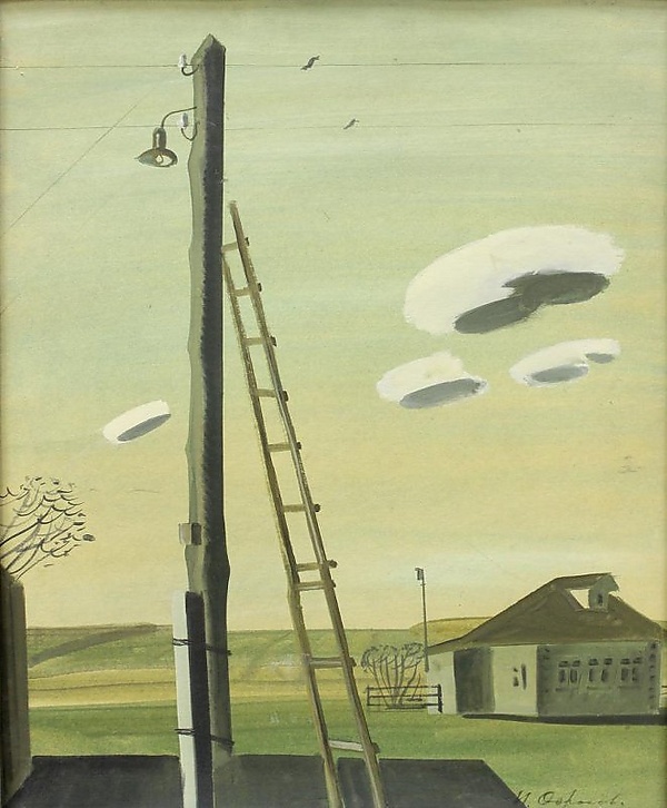 Работа представляет собой сельский пейзаж, выполненный в коричневато-зелёных и серых оттенках, что формирует сдержанную цветовую гамму. На первом плане слева расположен телеграфный столб с приставленной к нему лестницей, что придаёт композиции динамику и акцентирует внимание зрителя на переднем плане композиция (изобразительное искусство). В глубине справа изображён одноэтажный каменный домик, а на заднем плане простираются поля.