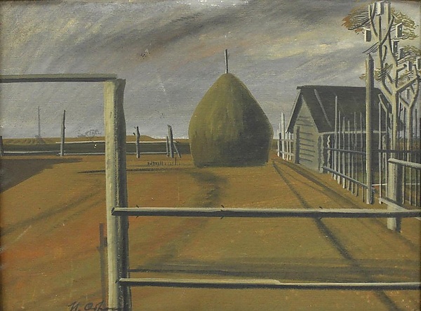 На картине представлен сельский пейзаж, выполненный в преобладающих коричневато-серых оттенках цветовой гаммы. На переднем плане изображён плетень, сквозь который видна пустая площадка перед деревянным сараем, расположенным в правой части композиции. Слева от сарая находится стог сена.