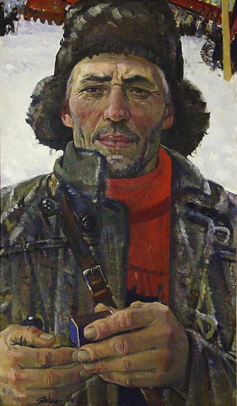На полотне представлен поясной портрет мужчины средних лет, изображённого в фас крупным планом. Он одет в шапку-ушанку и расстёгнутый ватник, через правое плечо перекинут ремень портупеи, а шею обвивает красный шарф. В руках мужчина держит спичечный коробок. На заднем плане видны красный экскаватор и отдельные группы рабочих, занятых на строительстве.