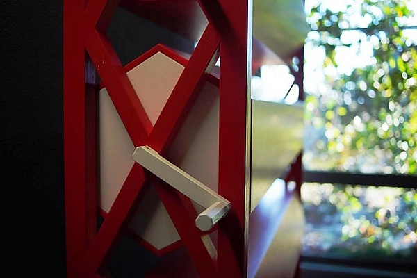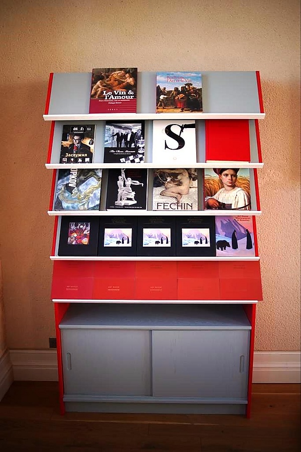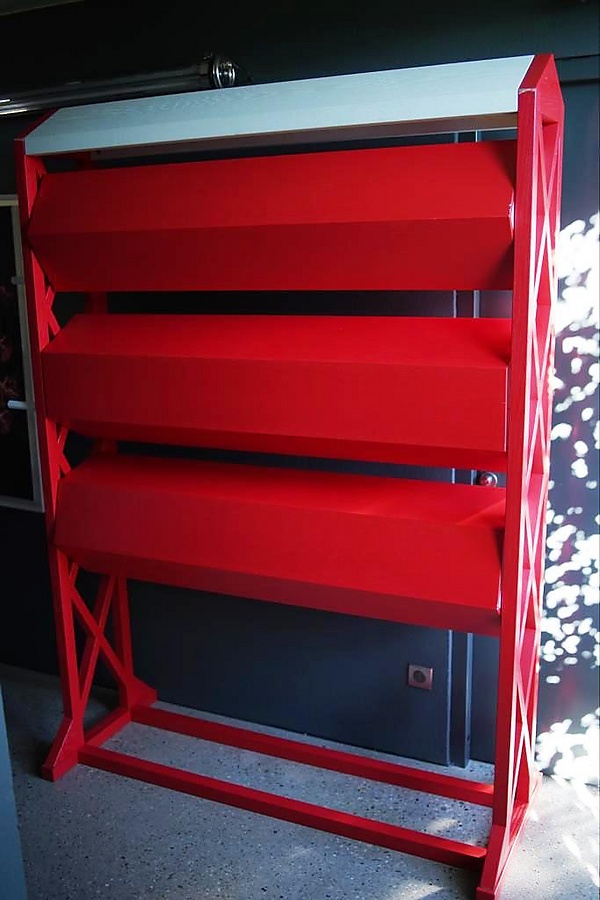Кроме того, в композицию входили два книжных стеллажа с пятью рядами наклонных поверхностей без застекления и выдвижными ящиками в нижнем ярусе, которые можно было превращать в небольшие столики или тумбы. Ещё одним элементом интерьера был экспозиционный стенд особой конструкции: установленные внутри него три горизонтальных шестигранных вращающихся барабана позволяли попеременно демонстрировать различные визуальные материалы[1][4].