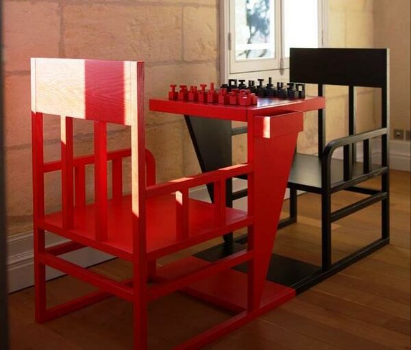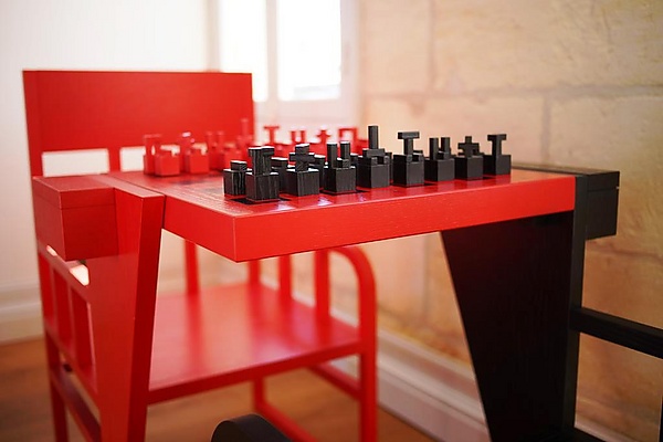 Вторым был шахматный стол: Родченко считал шахматы непременным элементом культурного досуга и важным подспорьем для интеллектуального развития пролетариата. Поверхность созданного им столика могла разворачиваться — с тем, чтобы обеспечить для игроков возможность меняться цветом фигур при начале новой игры, не вставая из-за стола. Два кресла для шахматистов имели подлокотники, прямоугольные спинки из четырёх параллельных вертикальных досок с прямой верхней перекладиной. Прямоугольные подножья, на которые они были установлены, смыкались ровно под серединой шахматного столика[1][4][8].