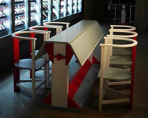 Многофункциональная установка помещалась у одной из стен помещения, тогда как центр композиции занимали два стола. Первый — длинный, предназначенный для совещаний, письменной работы и чтения, с каждой из сторон которого устанавливалось по шесть стульев без подлокотников с высокими каркасными спинками, имевшими полукруглые верхние перекладины. Он состоял из двух секций и мог быть разобран на два более коротких стола, рассчитанных на шестерых человек. Кроме того, складная конфигурация столешницы позволяла мгновенно увеличивать её ширину в два либо в три раза[1][4][8].