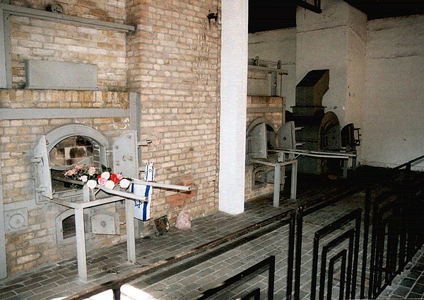 | Крематорий | Ворота лагеря (вид изнутри) с бывшей телефонной станцией и гидротехническим сооружением | Ворота лагеря (вид снаружи) с домом охраны | Стена Наций с братской могилой для 300 заключённых |